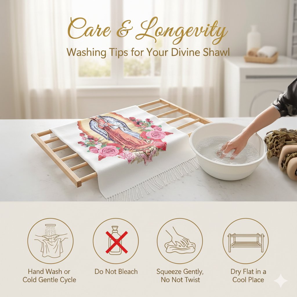 Chaque châle arbore un magnifique motif représentant la Vierge Marie, symbolisant la paix, l'espoir et la protection divine. Ce n'est pas seulement un accessoire, c'est un rappel quotidien de la foi et de la gratitude pendant cette période sacrée.