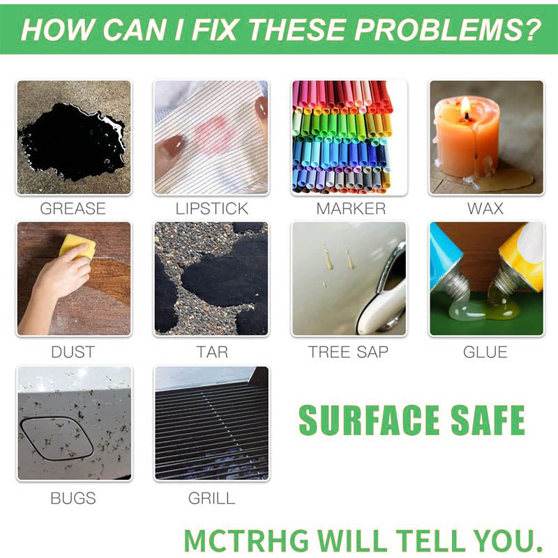 Élimine facilement la peinture en aérosol, les éclaboussures de peinture, le bitume, les petites taches noires, la gomme, la résine, l'huile d'arbre, le shellac, le ruban adhésif double face, la couche adhésive, les résidus d'impression offset, les taches de colle, etc.