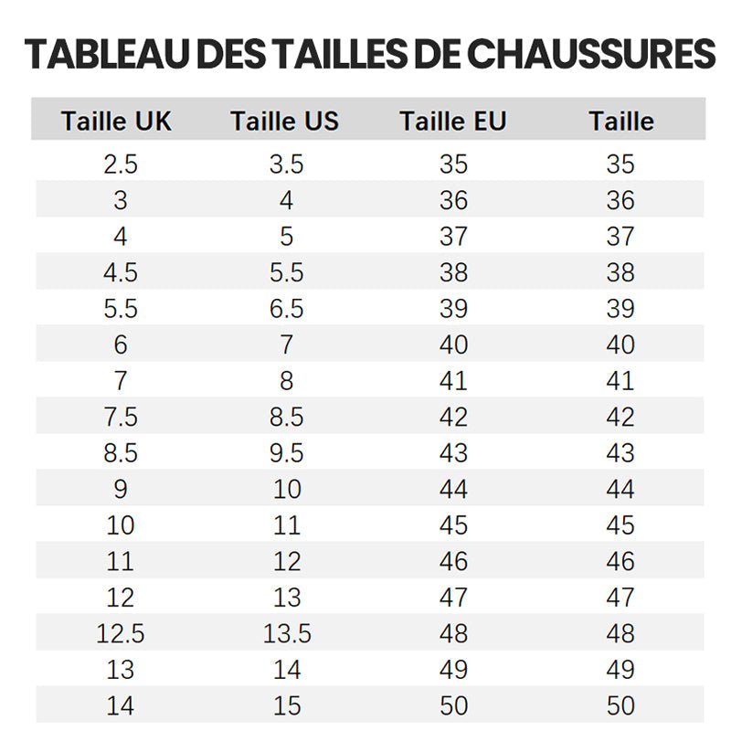 Conseils : cette pointure est la taille standard de l'UE. Vous pouvez choisir selon votre taille habituelle,Si vos pieds sont larges ou si votre cou-de-pied est haut, vous pouvez choisir une taille plus grande.